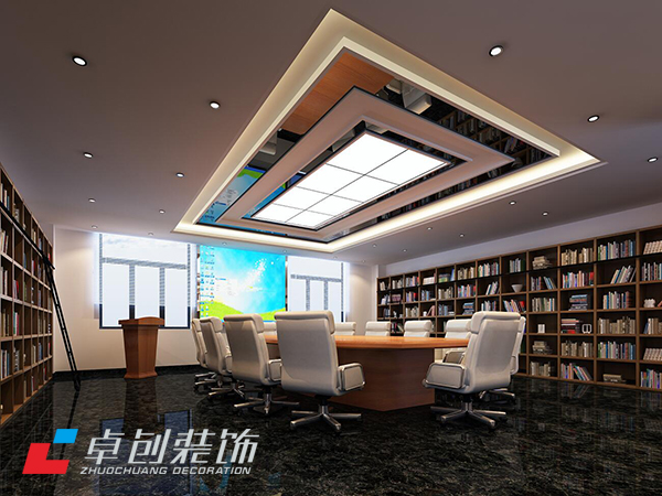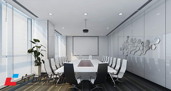 會議室裝修設計布置應簡單樸素,桌子上可以裝飾上常青盆栽,光線充足,空氣流通。可以采用企業標準色裝修墻面,或在里面懸掛企業旗幟,或在講臺、會議桌上擺放企業標志(物),以突出本企業特點。
